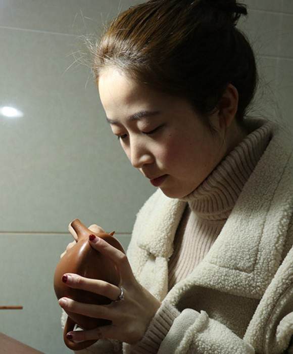 陈益叶简介:女,宜兴人,1992年生,国家级助理工艺美术师,跟随父亲学习制作紫砂壶多年,从小就开始接触制作难度较高的朱泥茶壶,所以她对于朱泥壶也有着独特的见解与热爱,其个人在紫砂艺术创作中有着特别的领悟与灵感,善于模仿名作又融入现代创意的作品,深受长者与收藏者好评。